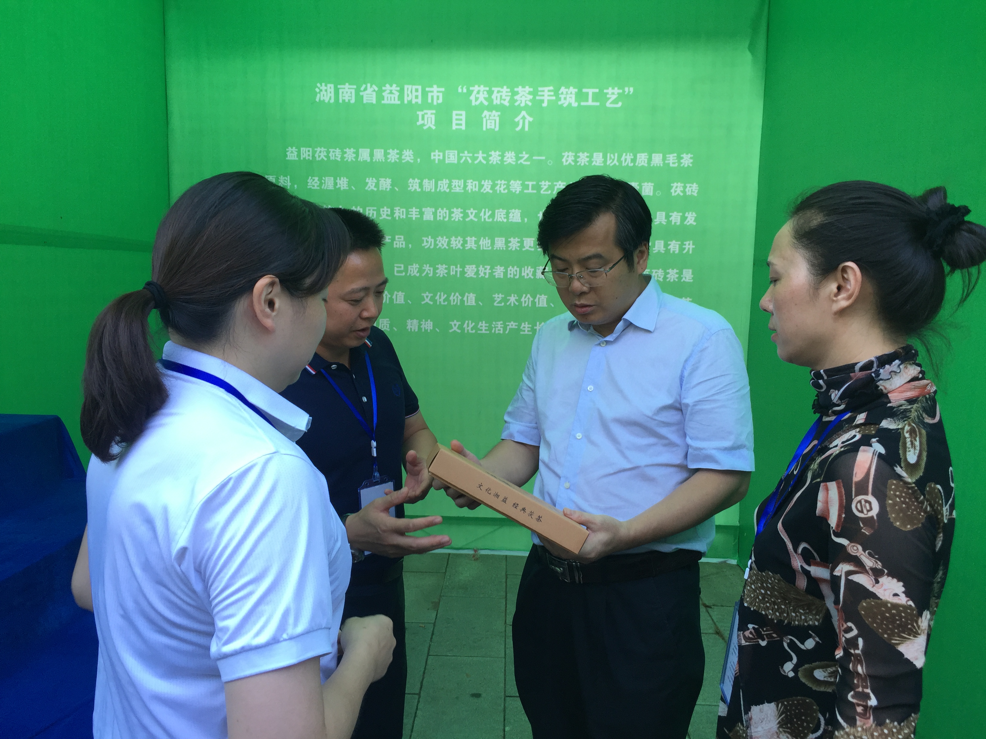 圖為湖南省文化和旅游廳副廳長、省文物局局長陳遠平( 左二)蒞臨湘益茯茶展位指導工作,茯磚茶非遺技藝傳承人徐迪軍、黃燕陪同。